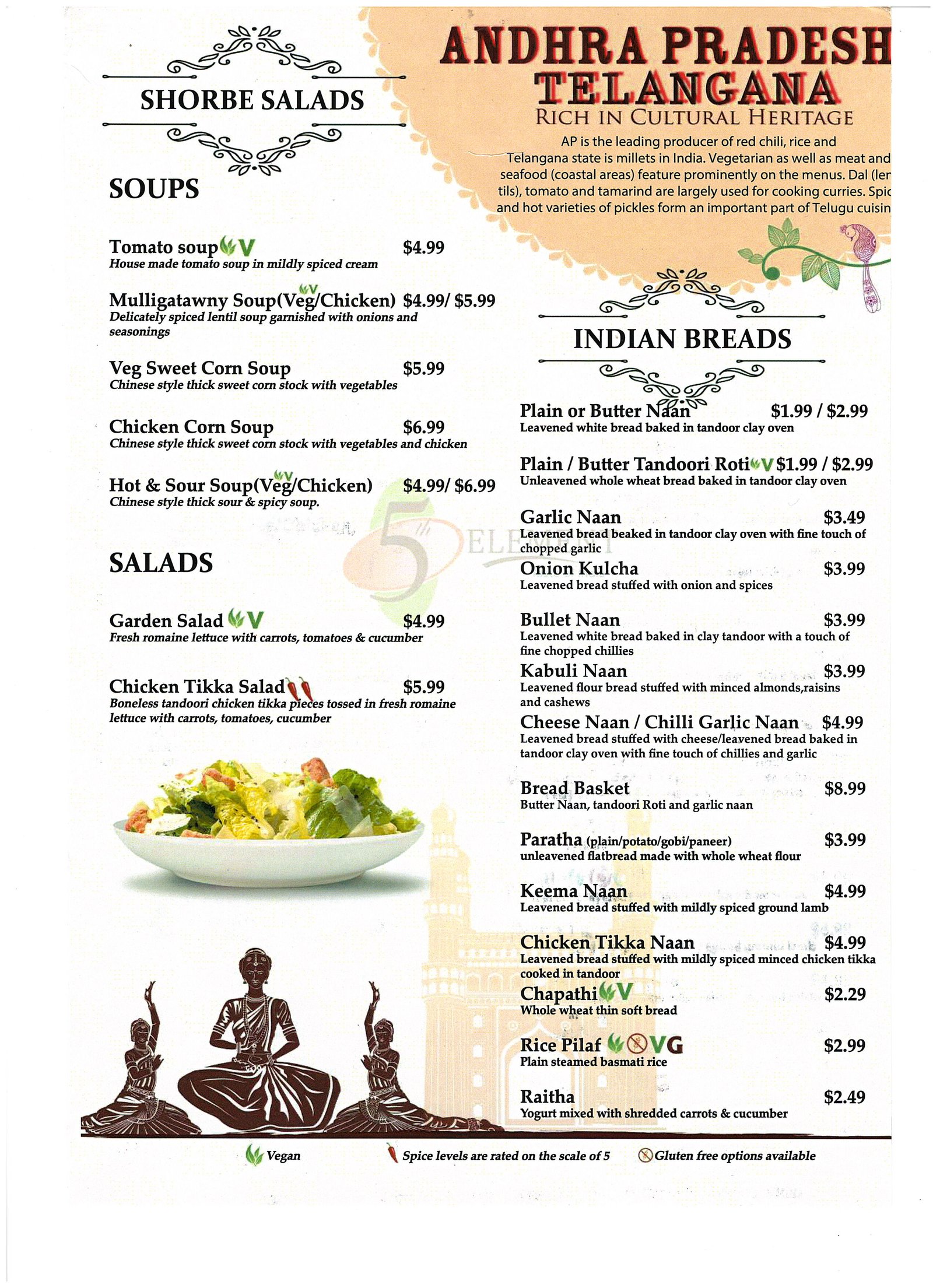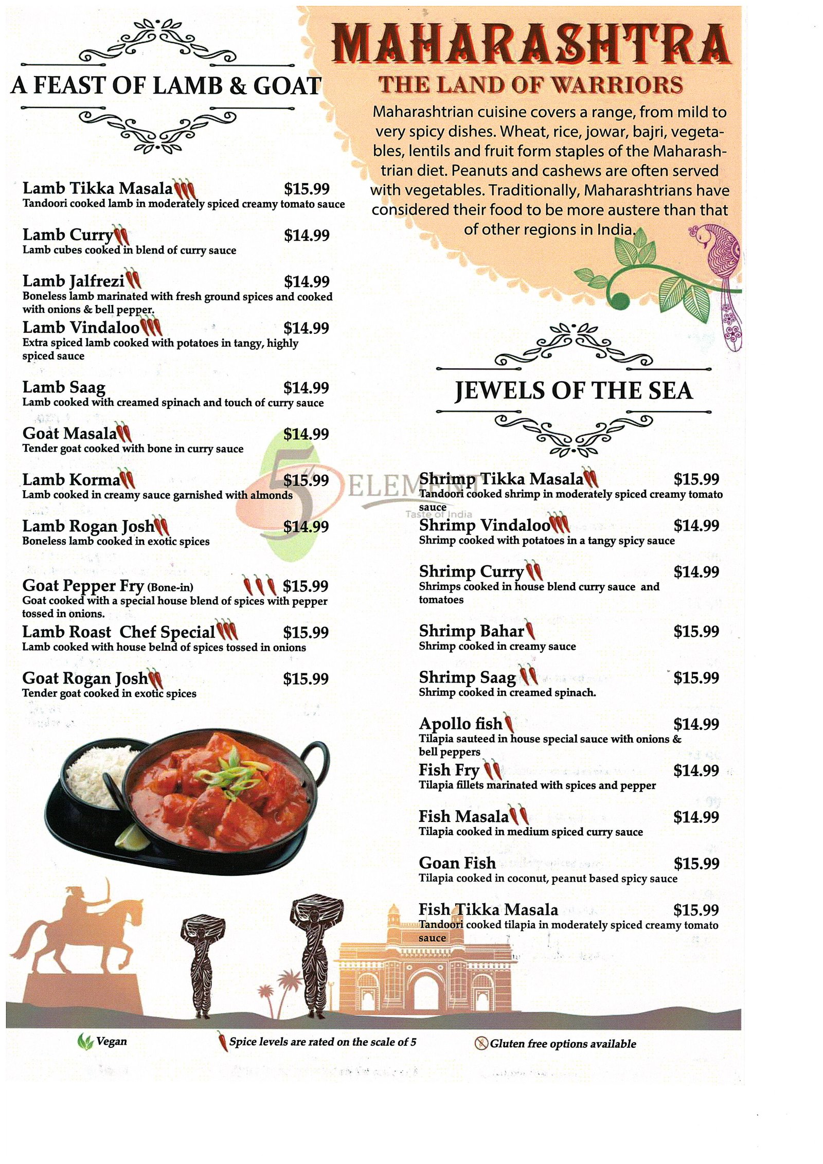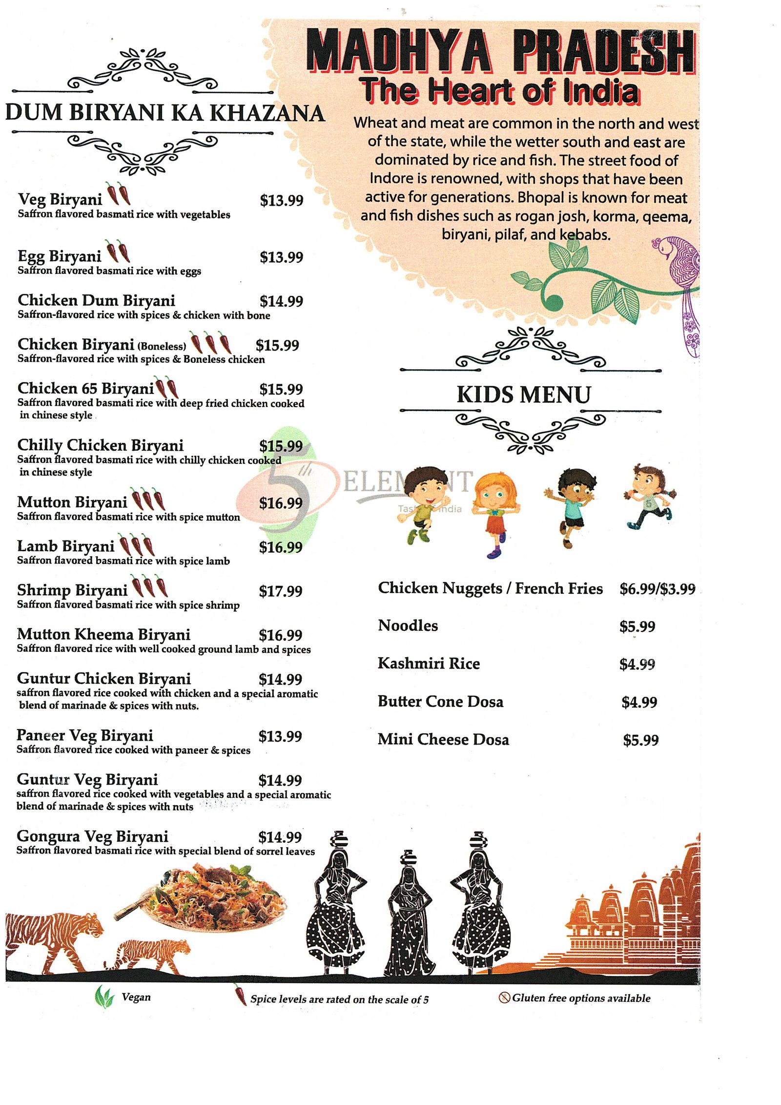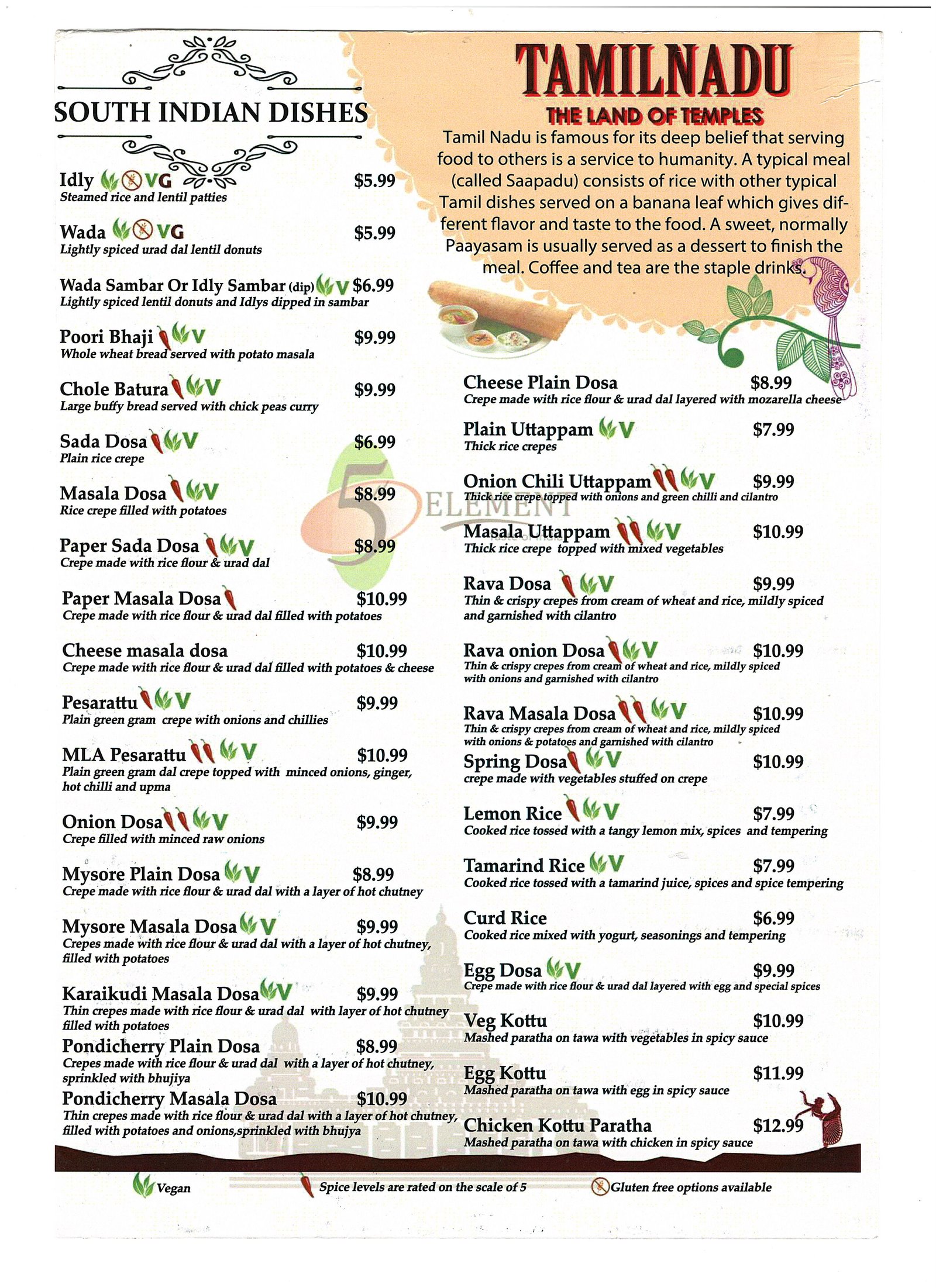 There are four basic elements - Earth, water, Air and Fire. We believe Food as the 5th element for survival.Our 5th Element Indian Restaurant is the finest Indian Cuisine with rich and unique flavors like its civilization. We offer a fresh and healthy approach to Indian cuisine. We use only the finest spices and ingredients from around the world to put together a truly tantalizing menu. Sizzle your taste buds with exquisite Indian and Chinese delicacies.